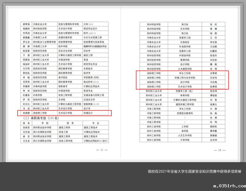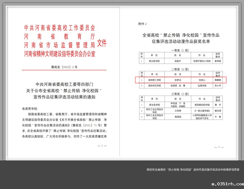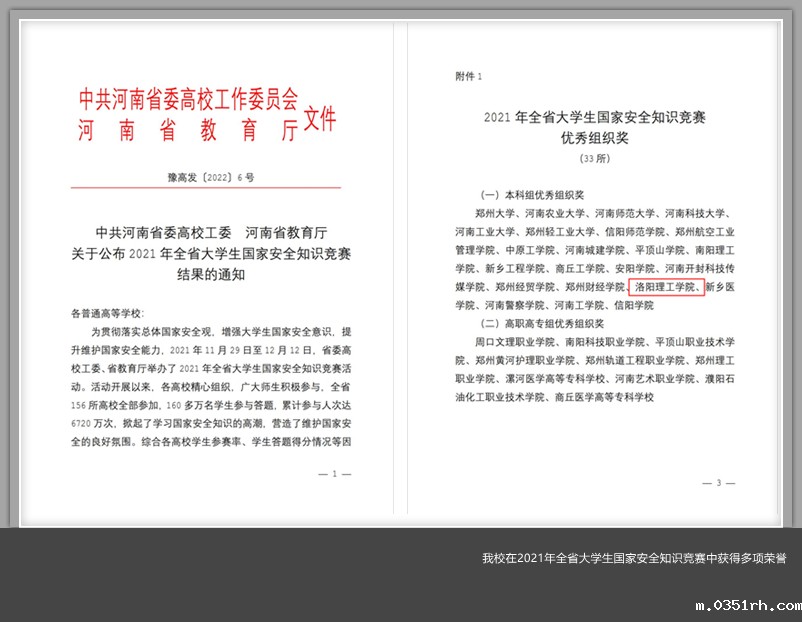 近日,省委高校工会、省教育厅、省市场监督管理局、省精神文明建设指导委员会办公室下发《中共河南省委高校工委等四部门关于公布全省高校“禁止传销 净化校园”宣传作品征集评选活动结果的通知》(豫高发〔2022〕2号),省委高校工委、省教育厅下发《中共河南省委高校工委 河南省教育厅关于公布2021年全省大学生国家安全知识竞赛结果的通知》(豫高发〔2022〕6号)文件,我校在这两项省级比赛活动中获得多项荣誉。