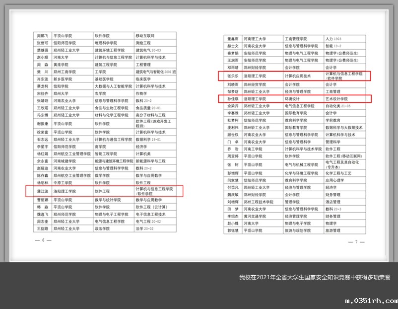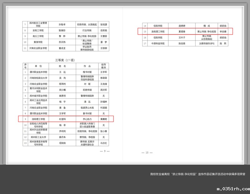 其中,我校在2021年全省大学生国家安全知识竞赛中获得优秀组织奖;我校计算机与信息工程学院学生蒲江波、张乐乐,艺术设计学院学生孙佳琪、张煜婕分获竞赛本科组优秀个人奖;我校教师宗雪婷、石亚伟、司吉梅、张勇强分获竞赛本科组指导教师奖。在全省高校“禁止传销 净化校园”宣传作品征集评选活动中,我校学生张梦洁的作品《勿贪心》获得动漫作品二等奖,杜登科的作品《齐心协力》、夏煜锋的作品《禁止传销 净化校园》分获书法作品三等奖。
