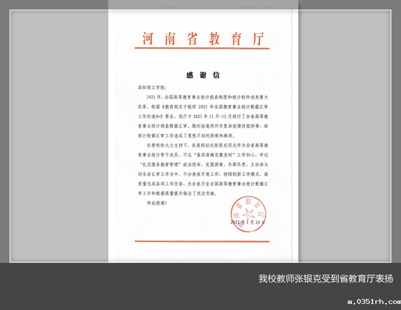 近日,河南省教育厅发来感谢信,表扬我校教师张银克为全省高等教育事业统计数据汇审工作做出的贡献。