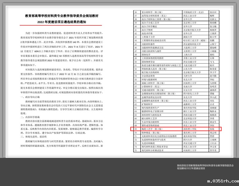 近日,教育部高等学校材料类专业教学指导委员会公布了“规划教材”2022年度建设项目遴选结果,河南省4项教材建设项目获批立项,我校张锐教授主编的《陶瓷工艺学(第3版)》获得立项,这是我校教材建设方面取得的最新突破,也标志着我校在教材建设方面迈出了重要一步。