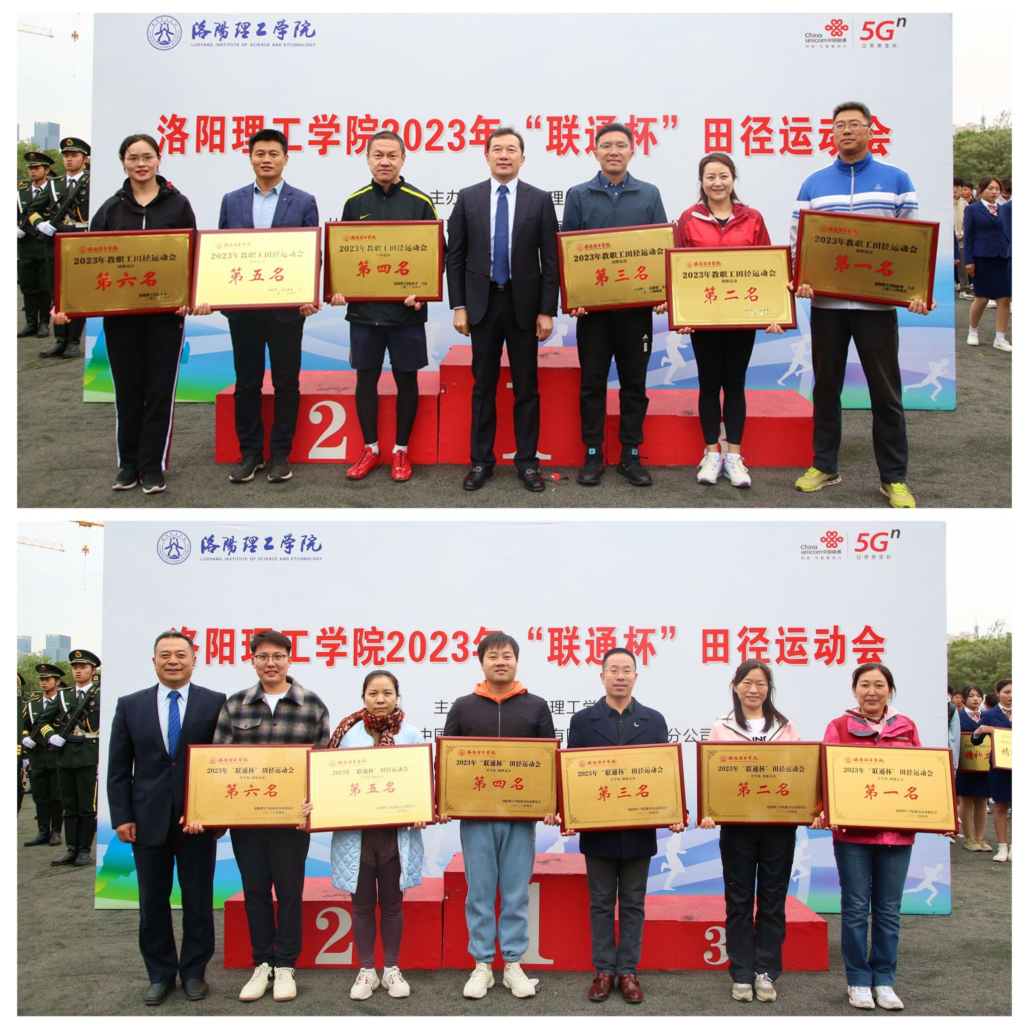 河南省教科文卫体工会主席张学勇,中国联合网络通信有限公司洛阳市分公司党委书记、总经理郭玉鑫分别为本次运动会教工组和学生组精神文明队颁奖