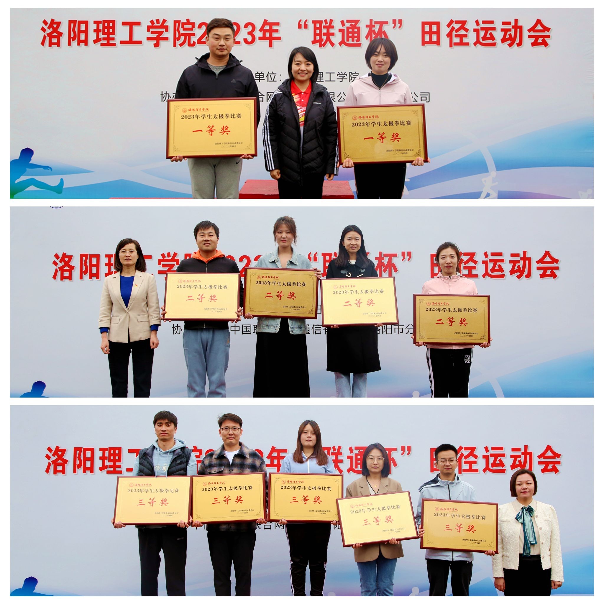 中国联合网络通信有限公司洛阳市分公司党委委员、副总经理高磊,高校中心主任崔海燕;副校长丁梧秀分别为2023年学生太极拳比赛一、二、三等奖获奖单位颁奖