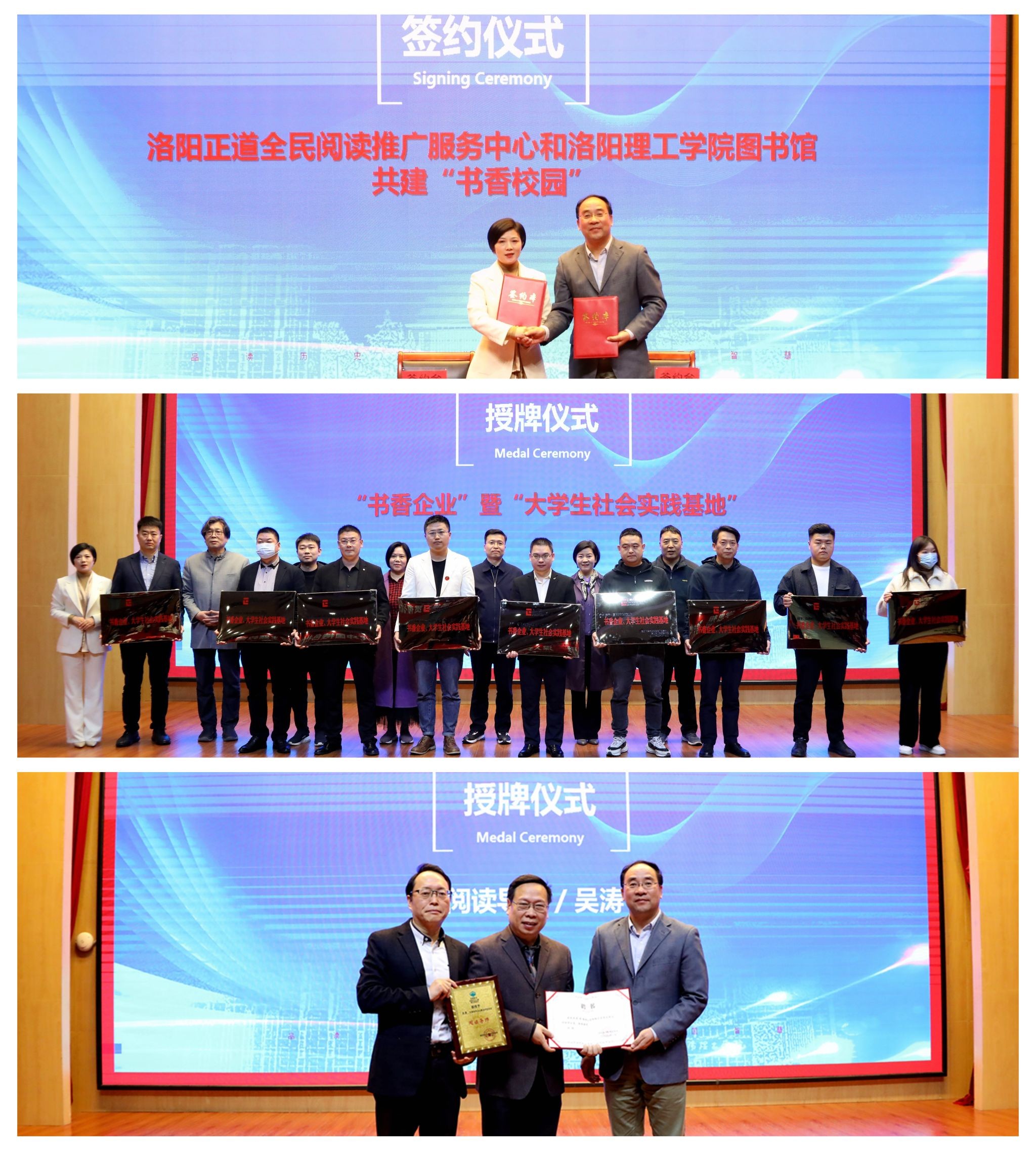大会举行了BETVLCTOR登录入口图书馆与洛阳正道全民阅读推广中心共建“书香校园”签约仪式和“书香企业”暨“大学生社会实践基地”授牌仪式,特邀嘉宾为BETVLCTOR登录入口“阅读之星”、“阅读推广标兵”、“洛阳全民阅读推广大使”颁发奖状,BETVLCTOR登录入口图书馆负责人为吴涛教授颁发特约研究员聘书。