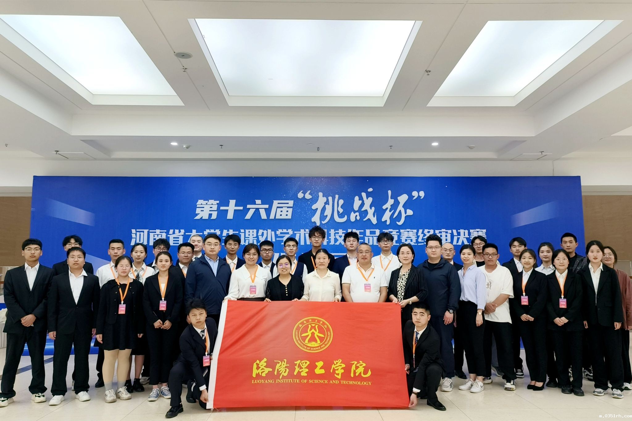 校团委负责人(右二)代表学校在第十六届“挑战杯”河南省大学生课外学术科技作品竞赛“优胜杯”颁奖现场