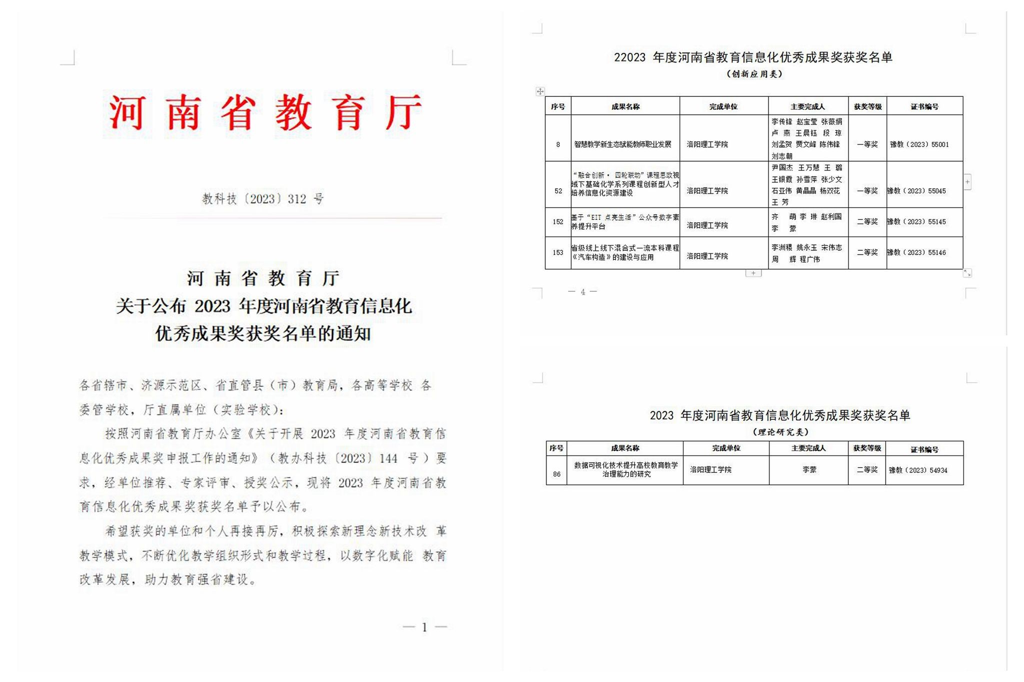 近日,河南省教育厅下发了《关于公布2023年度河南省教育信息化优秀成果奖获奖名单的通知》(教科技〔2023〕312号),我校推荐申报的成果中有5项获奖,包含一等奖2项、二等奖3项。其中,1项为理论研究类成果,4项为创新应用类成果。