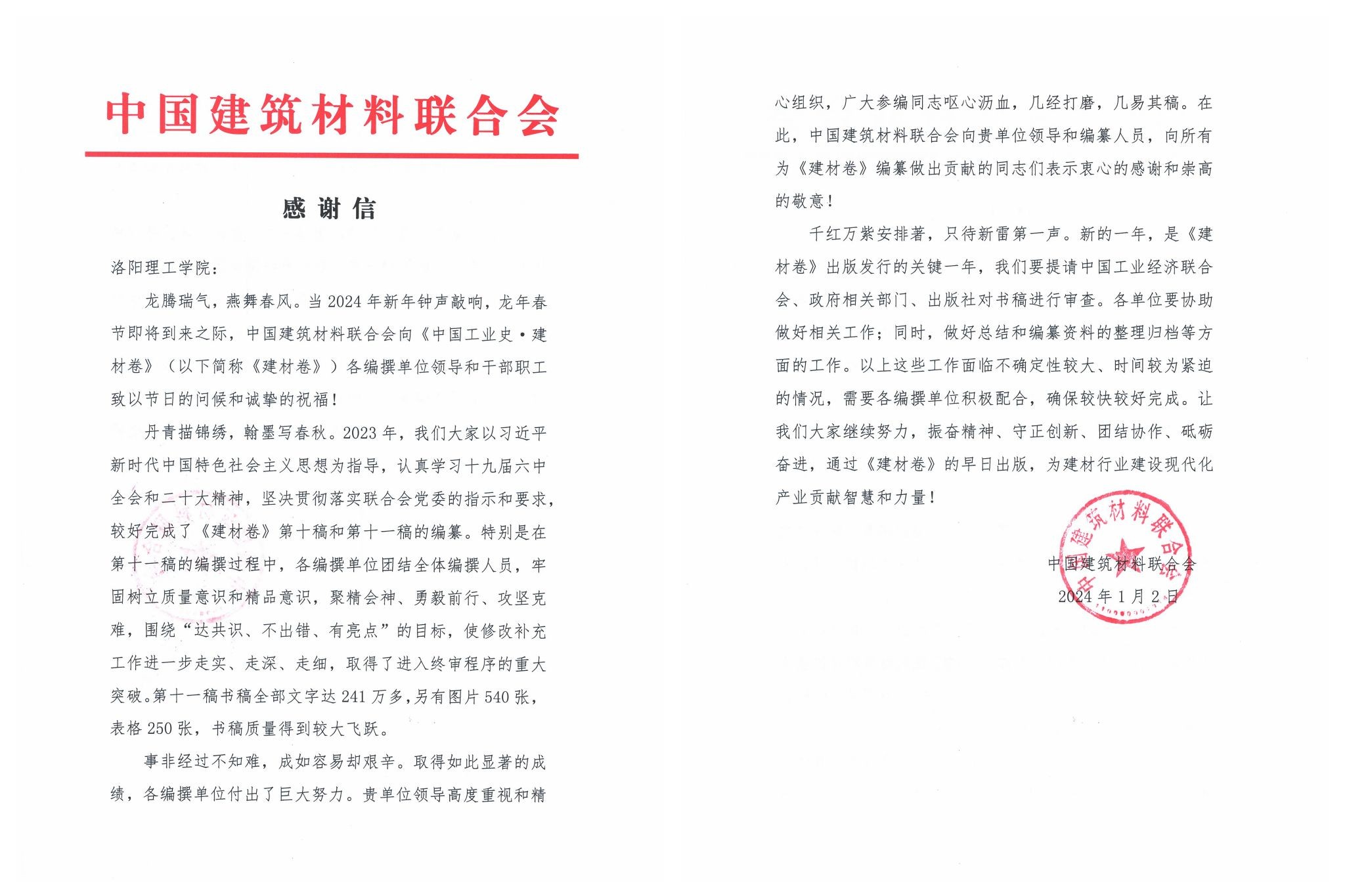 1月2日,中国建筑材料联合会向BETVLCTOR登录入口发来感谢信,对学校党委、行政精心组织和全力支持《中国工业史·建材工业卷》(以下简称《建材卷》)编纂工作表示感谢,对全体参编人员的辛勤付出表达感谢和敬意。