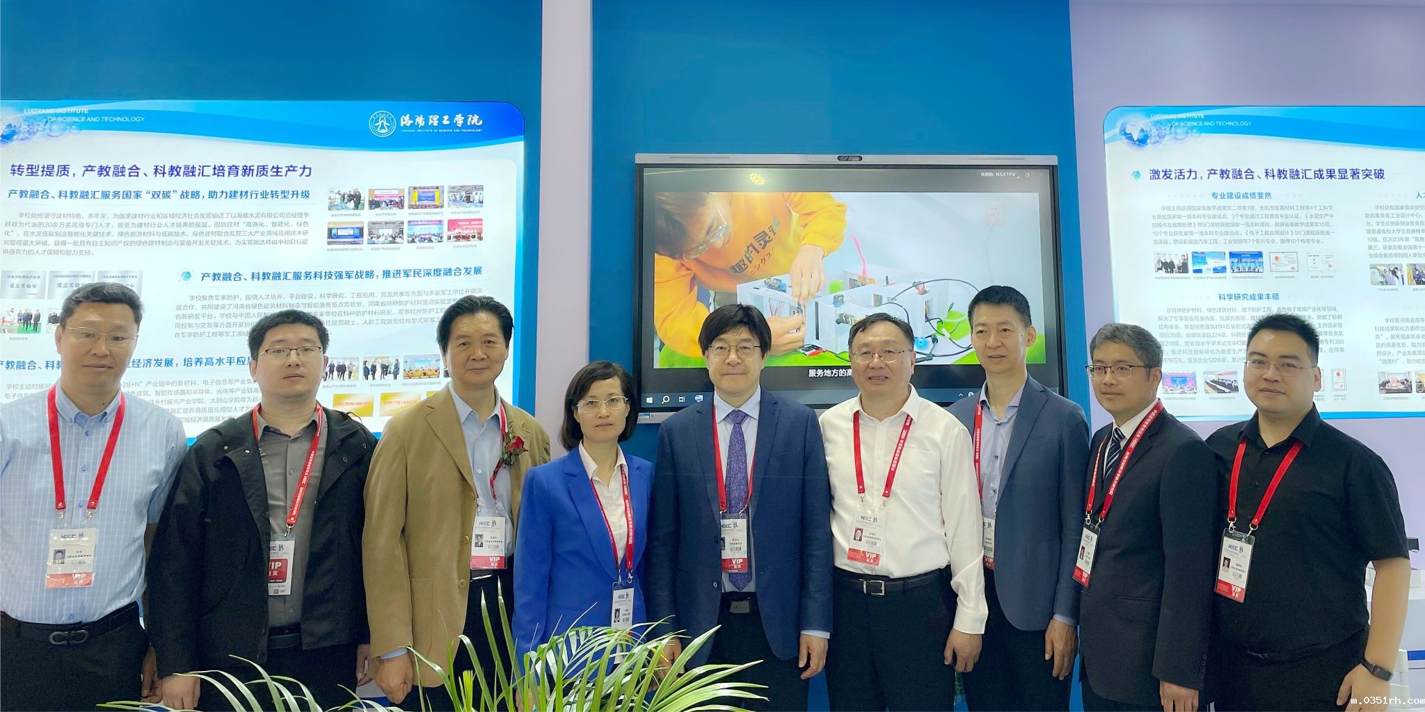 河南省政协常委、委员联络委员会主任郑邦山(左五),河南省高等教育学会常务副会长俞海洛(右四)一行莅临我校展区参观指导