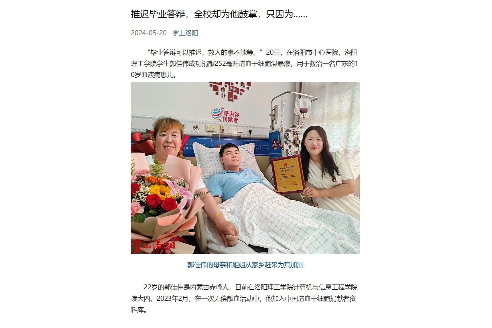 “掌上洛阳”微信公众号,2024年5月20日,《推迟毕业答辩,全校却为他鼓掌,只因为……》