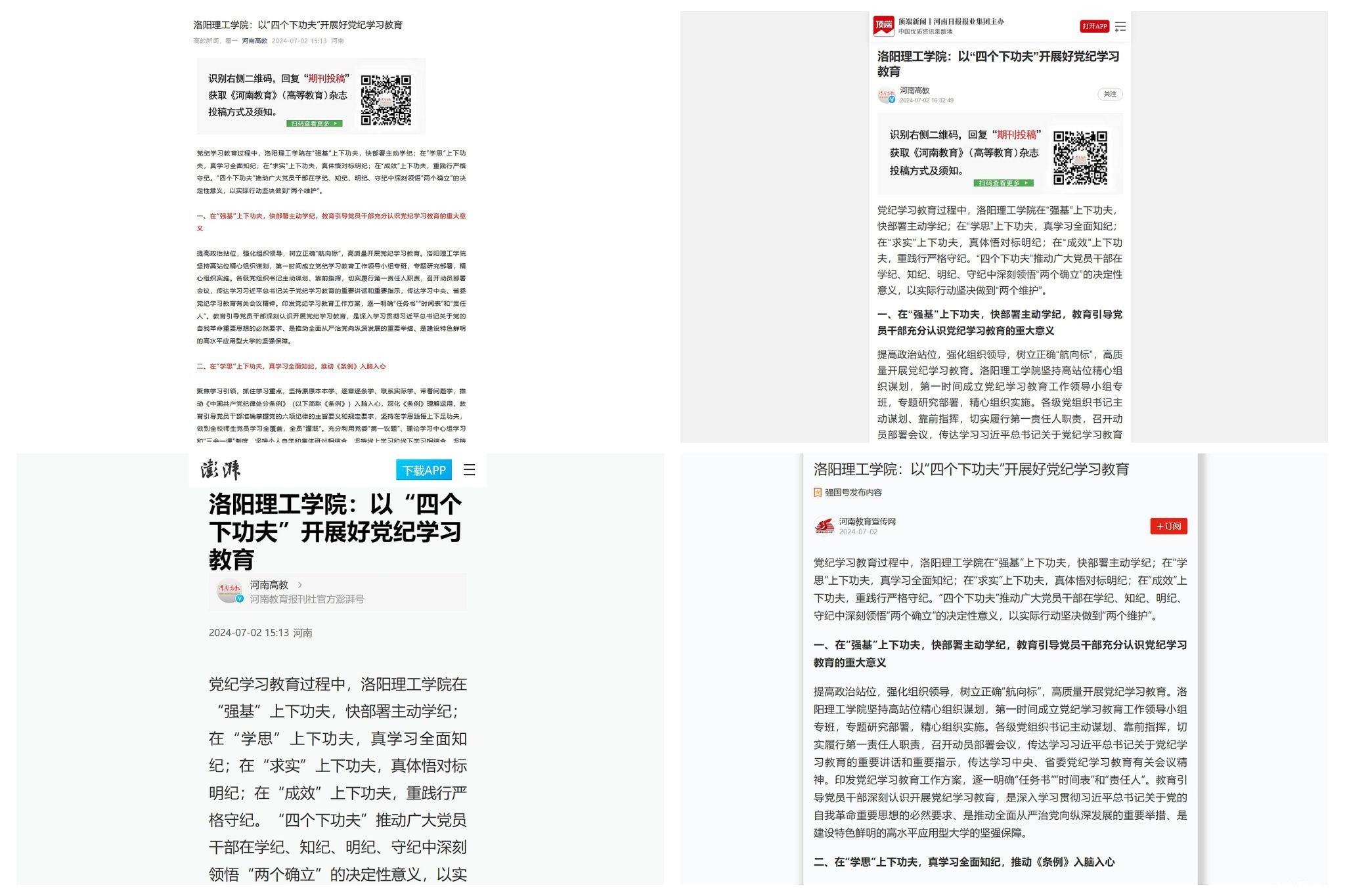 7月2日,河南高教媒体矩阵所属的微信公众号、顶端号、澎湃号及河南教育新闻网强国号分别以《BETVLCTOR登录入口:以“四个下功夫”开展好党纪学习教育》为题报道我校深入学习贯彻《中国共产党纪律处分条例》,开展党纪学习教育。原文如下: