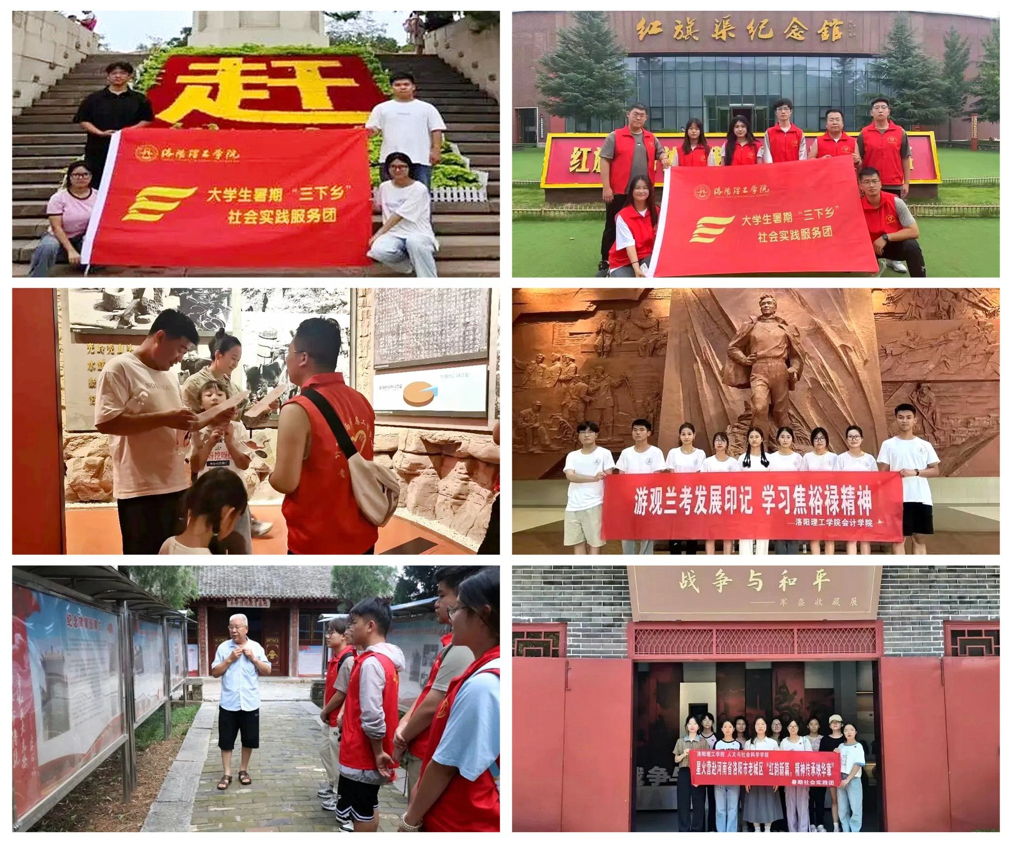经济与管理学院“西柏坡之行”实践团,计算机与信息工程学院“‘豫’见红旗渠”实践团,会计学院“赓续红色会计精神”实践团、“游观兰考发展印记”实践团,人文与社会科学学院“星火营”实践团、教育科学与音乐学院“艺心向党 红色研学”实践团开展暑期社会实践活动掠影。