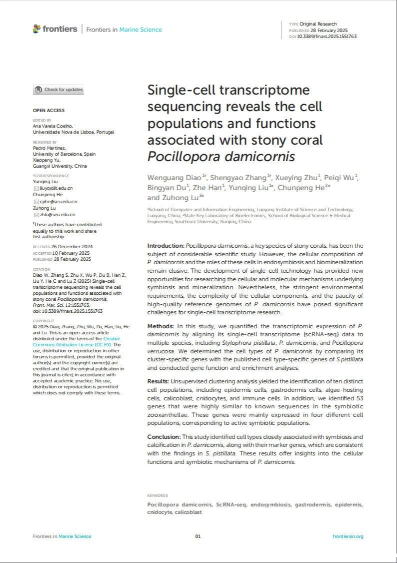 近日,由我校计算机学院/软件学院刘云卿博士带领的本科生研究小组在国际期刊《Frontiers in Marine Science》上发表研究论文《Single-cell transcriptome sequencing reveals the cell populations and functions associated with stony coral Pocillopora damicornis》。我校2021级软件工程专业本科生张圣耀同学为论文共同第一作者,刘云卿博士为共同通讯作者,吴沛琪、朱雪颖2名同学为共同参与作者。