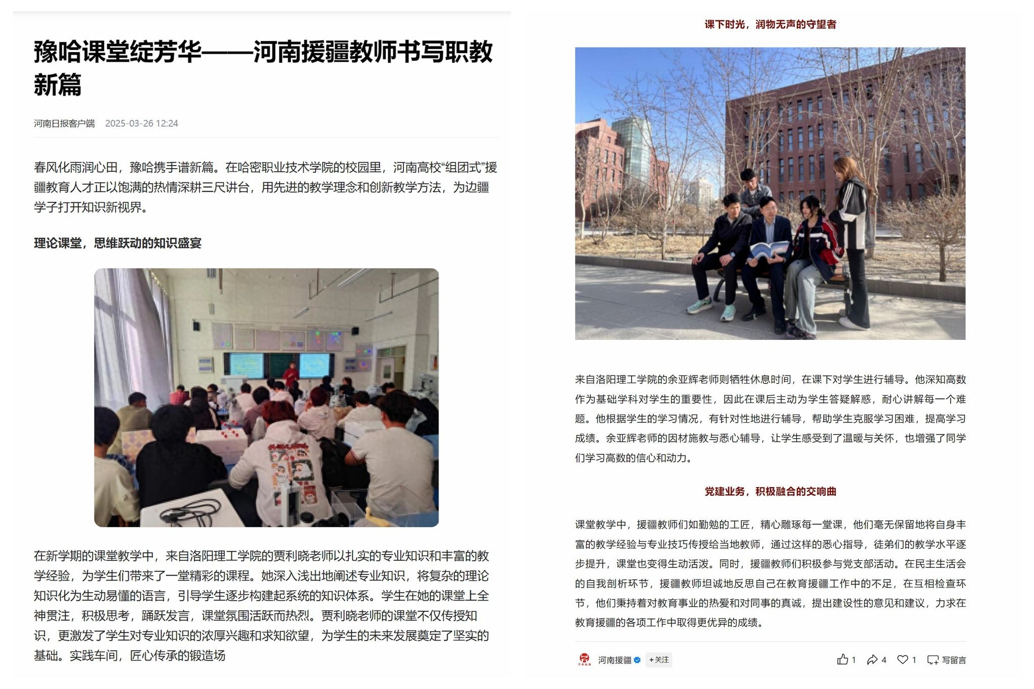 1.河南日报客户端,2025年3月26日,《豫哈课堂绽芳华——河南援疆教师书写职教新篇》