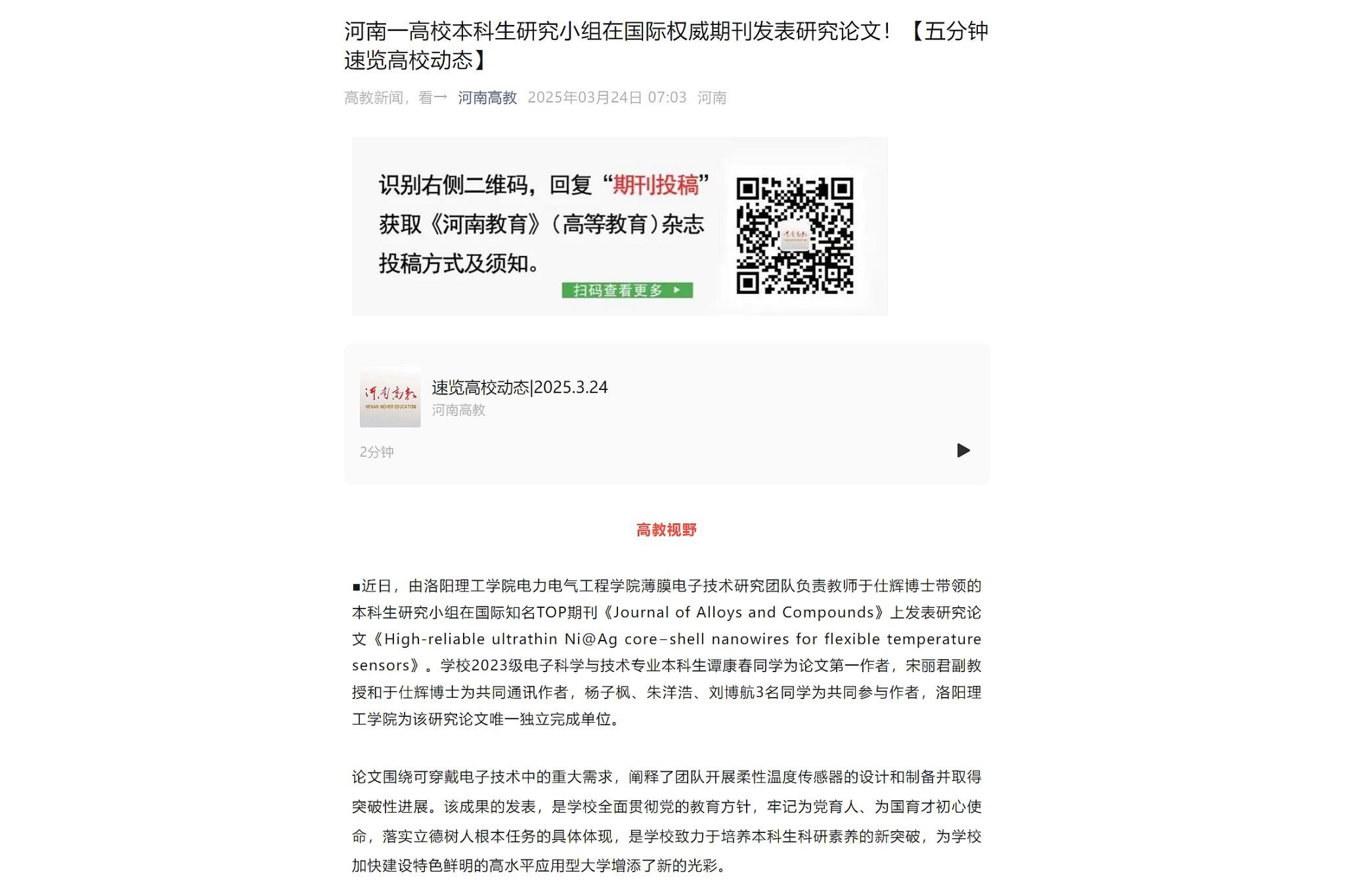 3月24日,“河南高教”微信公众号以《河南一高校本科生研究小组在国际权威期刊发表研究论文!【五分钟速览高校动态】》为题,报道我校电力电气工程学院薄膜电子技术研究团队负责教师于仕辉博士带领的本科生研究小组在国际知名TOP期刊《Journal of Alloys and Compounds》上发表研究论文《High-reliable ultrathin Ni@Ag core−shell nanowires for flexible temperature sensors》。