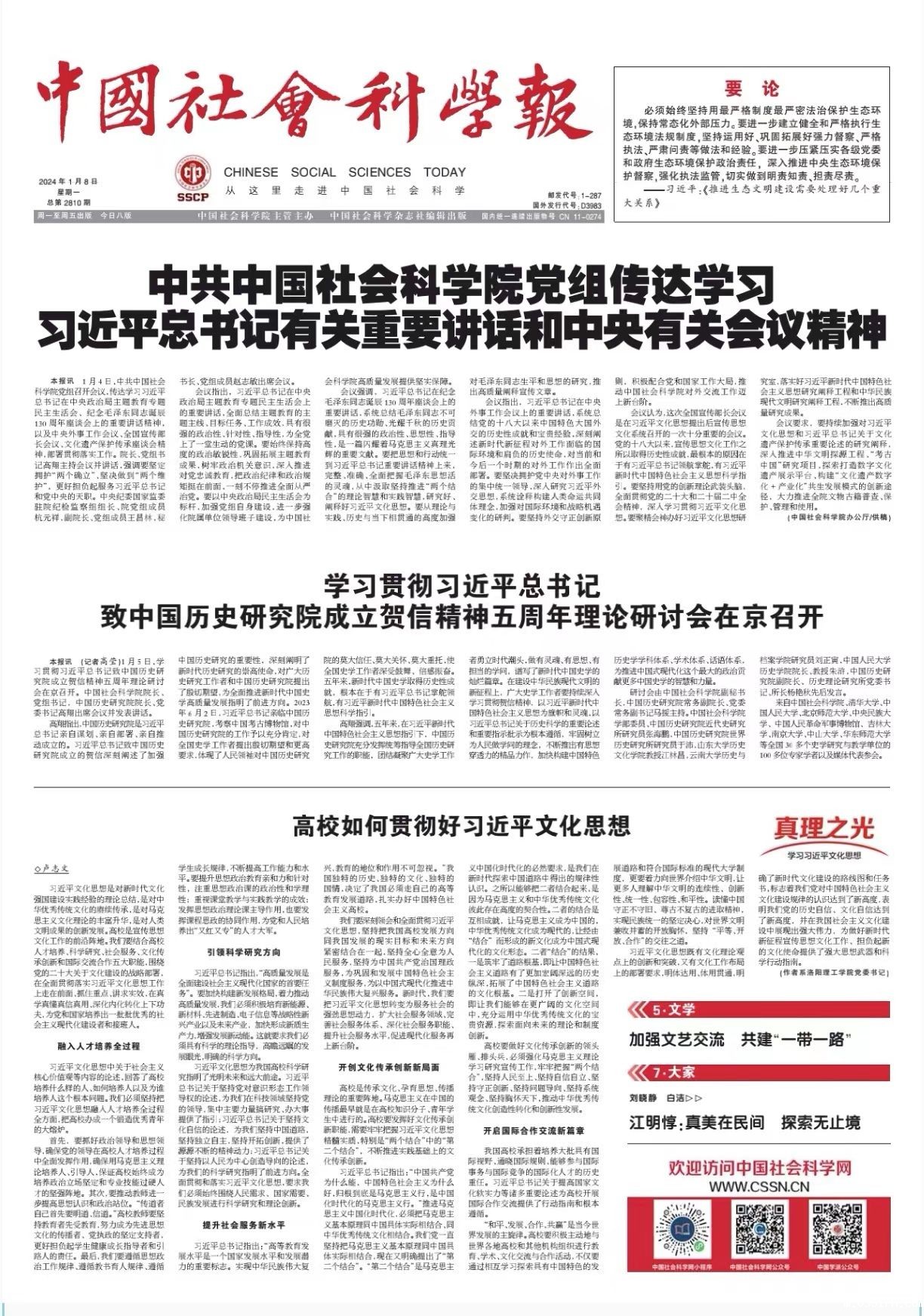 1月8日出版的《中国社会科学报》头版发表我校党委书记卢志文教授的理论文章,题目是《高校如何贯彻好习近平文化思想》。