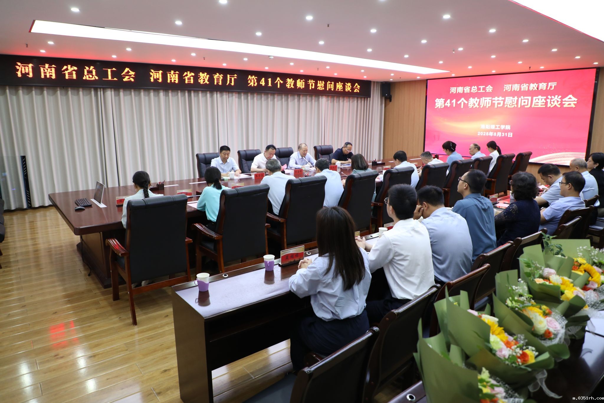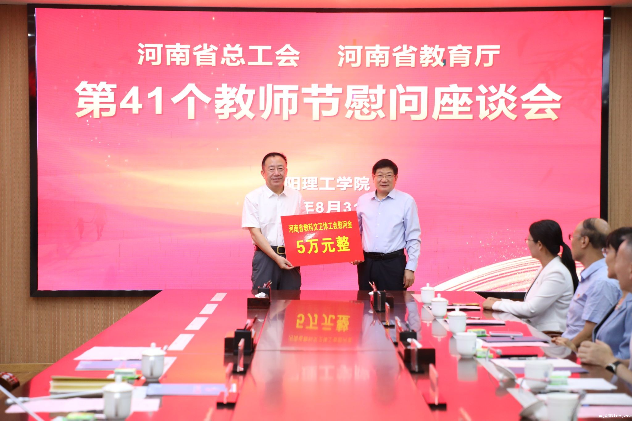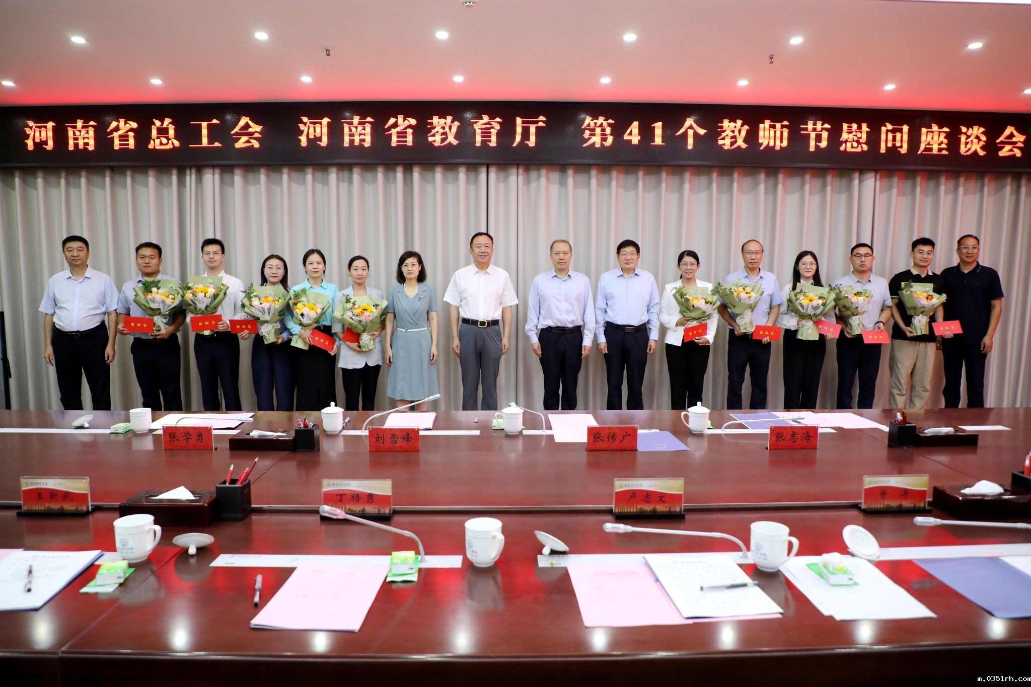 在第41个教师节来临之际,8月31日上午,河南省总工会、河南省教育厅在我校王城校区办公楼116会议室举行第41个教师节慰问座谈会。河南省总工会副主席、党组成员刘雪峰,河南省教育厅党组成员、副厅长张传广,河南省教科文卫体工会主席张学勇,河南省教育厅人事处三级调研员张志海,校领导卢志文、丁梧秀、曾涛、王新武、冯超、李传锋出席座谈会,我校相关部门负责人、优秀教师代表参加座谈会。座谈会由校长丁梧秀主持。