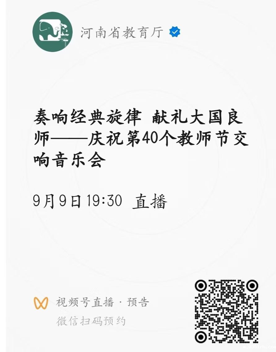 为进一步做好教师节宣传活动,营造浓厚的尊师重教氛围,本次交响音乐会将采用“现场观看+线上直播”的方式进行,向广大教师致以节日祝福,我校老师可通过“河南省教育厅”微信视频号收看直播。现就网上收看交响音乐会有关事项通知如下: