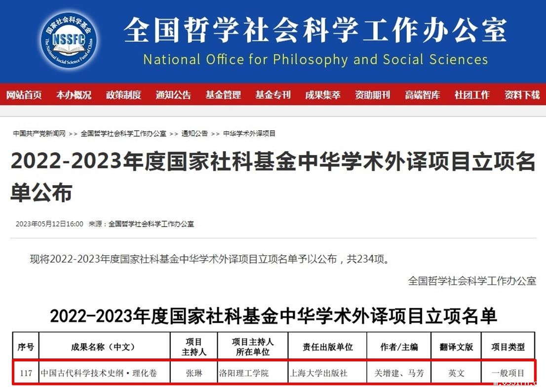 近日获得喜讯,全国哲学社会科学工作办公室公布了2022-2023年度国家社科基金中华学术外译项目立项名单,我院副院长张琳副教授主持申报的《中国古代科学技术史纲·理化卷》英文翻译项目获批立项,这是我院在国家社科基金项目上零的突破,也是我校首次获批此类国家社科基金项目。