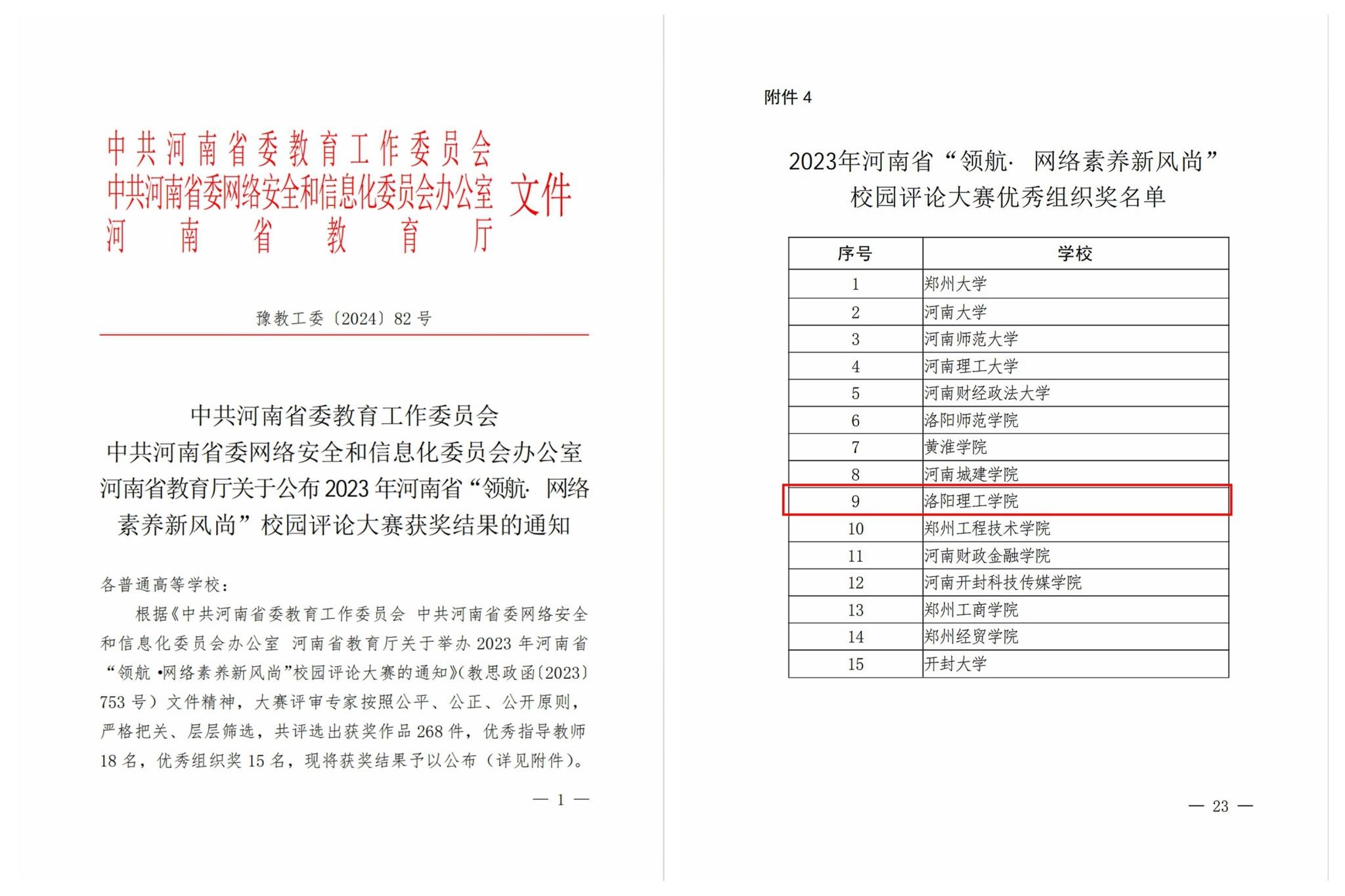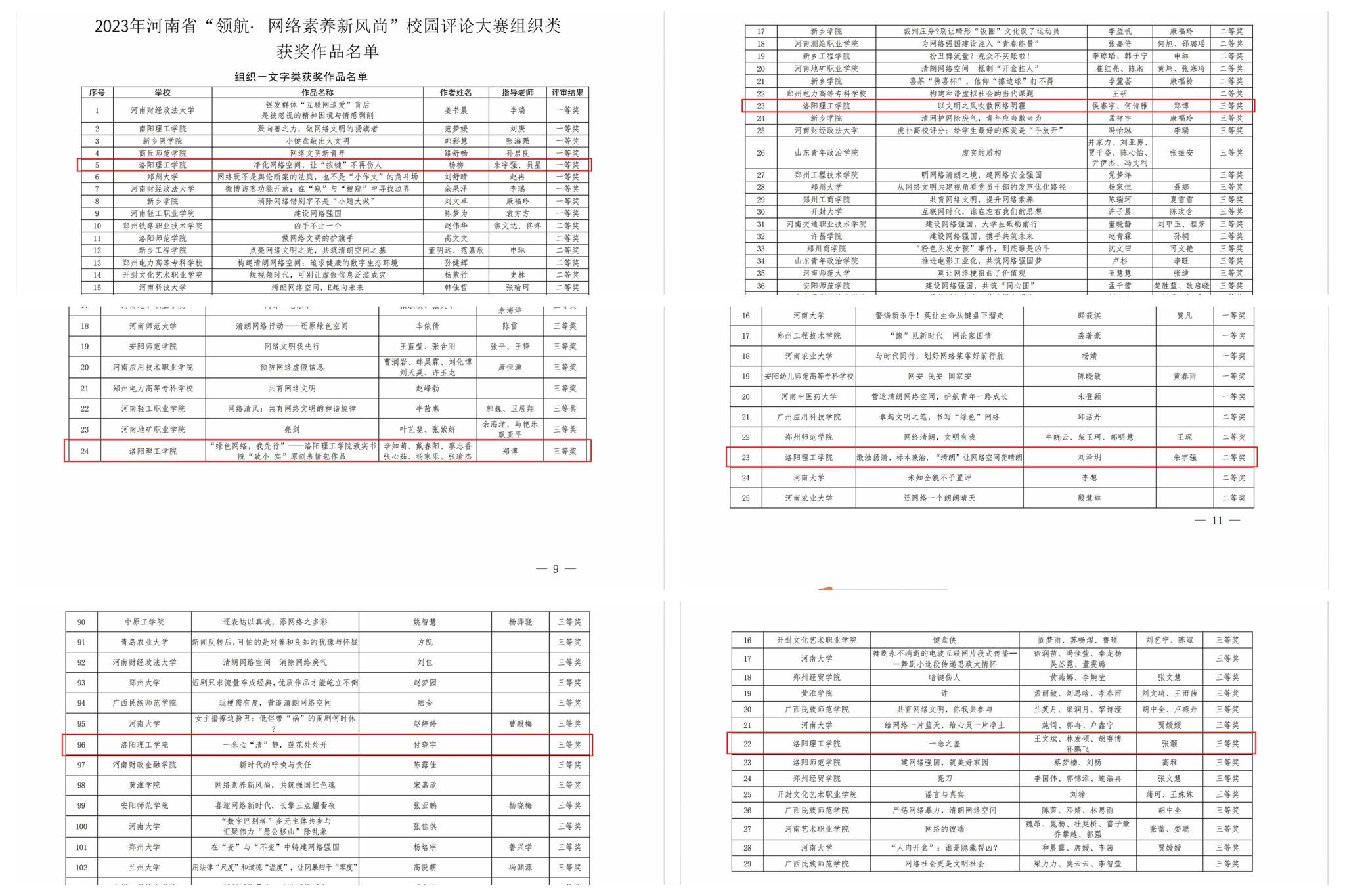近日,中共河南省委教育工委、中共河南省委网信办、河南省教育厅发布《关于公布2023年河南省“领航•网络素养新风尚”校园评论大赛获奖结果的通知》(豫教工委【2024】82 号),我校申报的作品荣获一等奖1项、二等奖1项、三等奖4项,学校荣获优秀组织奖。