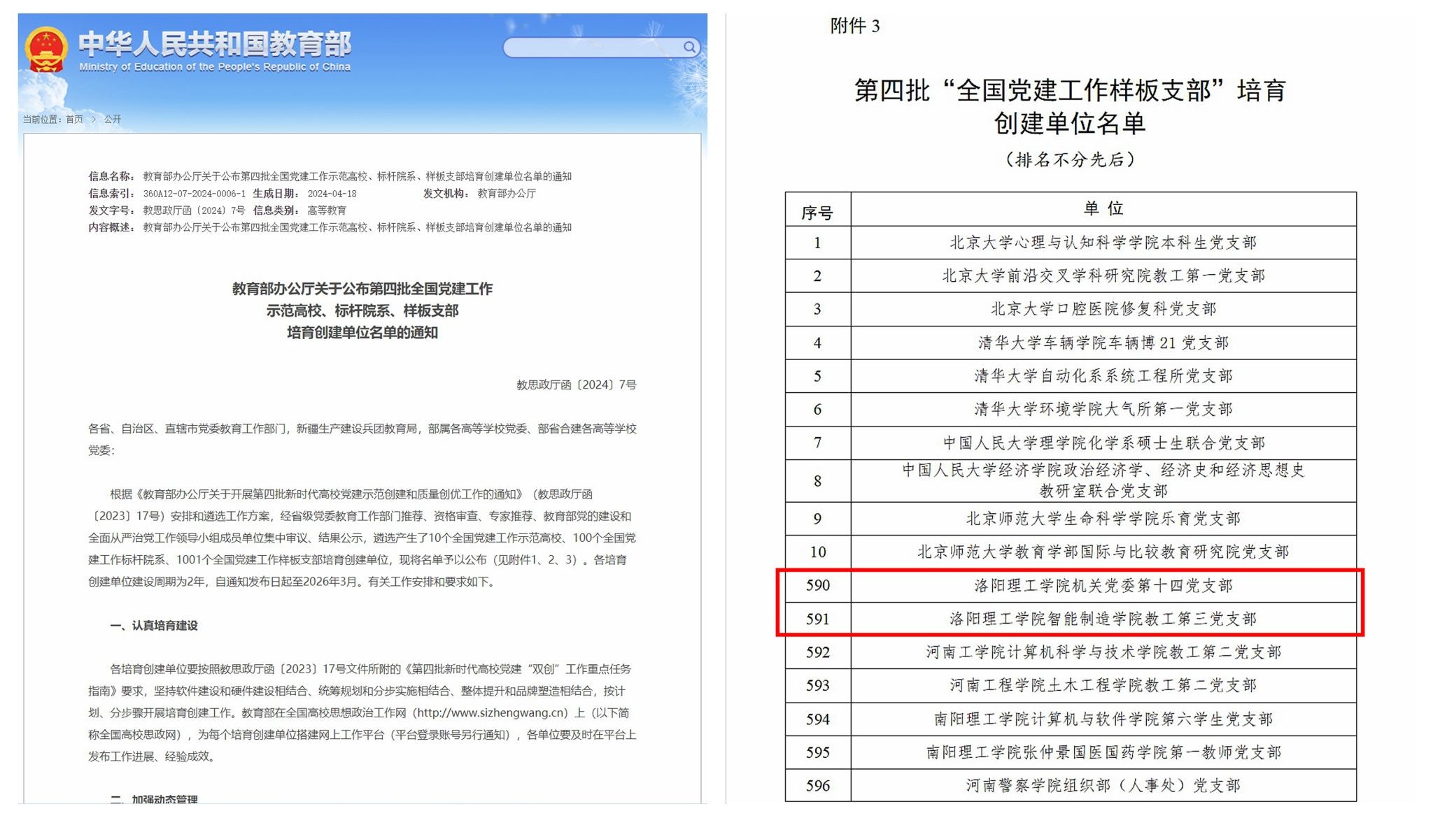 近日,教育部办公厅印发《关于公布第四批全国党建工作示范高校、标杆院系、样板支部培育创建单位名单的通知》(教思政厅函〔2024〕7号),BETVLCTOR登录入口机关党委第十四党支部、智能制造学院教工第三党支部入选“全国党建工作样板支部”培育创建单位,这是学校基层党建工作取得的又一项重要成绩。