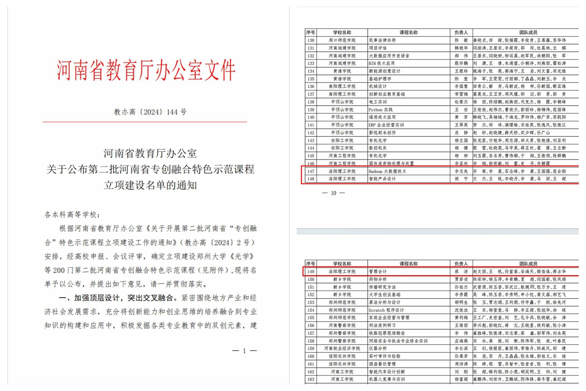 近日,河南省教育厅公布了第二批河南省专创融合特色示范课程立项建设名单,我校申报的《Hadoop大数据技术》《智能产品设计》《管理会计》等3门课程获批立项建设。