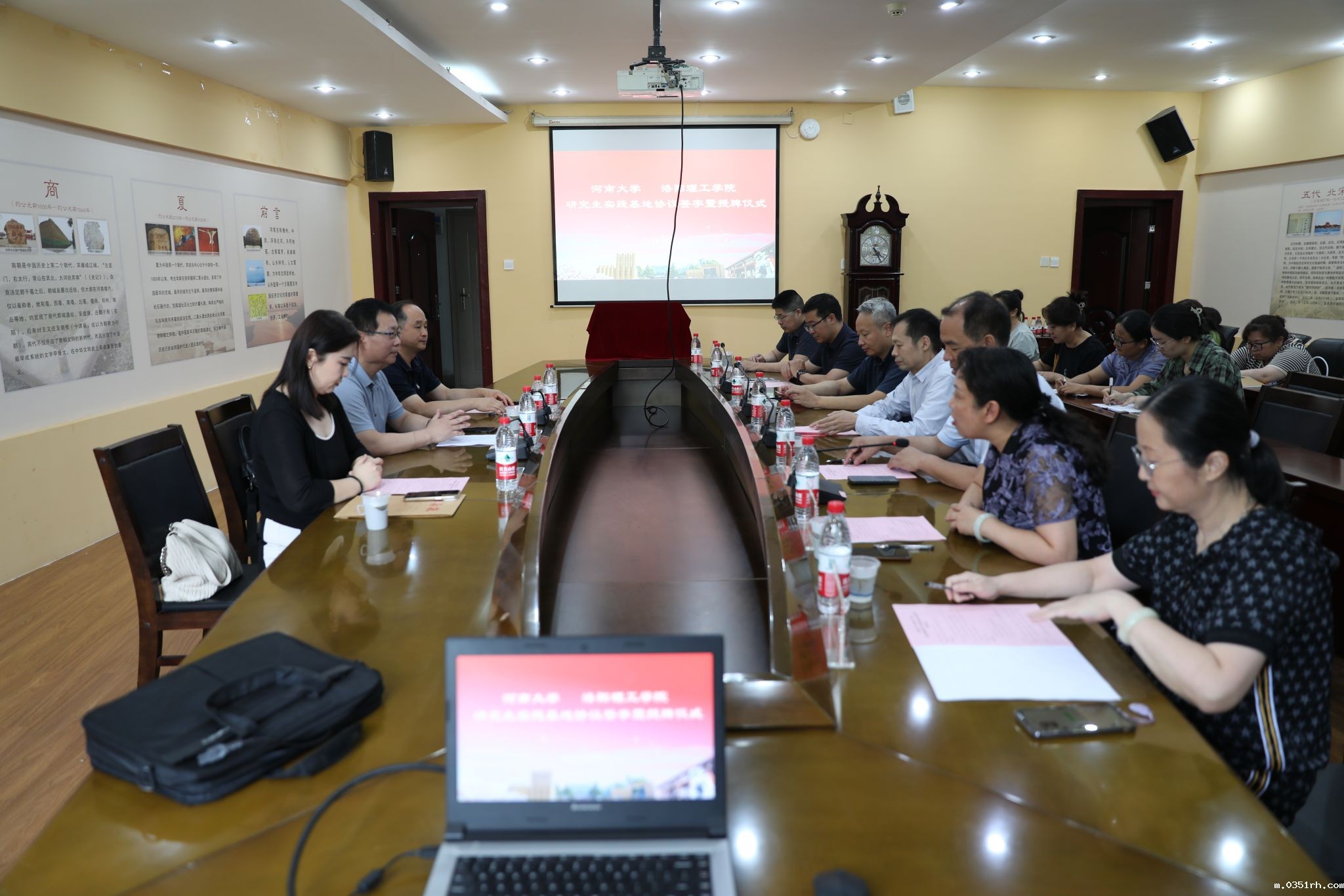 6月25日上午,我校与河南大学图书情报研究生实践基地签约暨授牌仪式在开元校区图书馆会议室举行。河南大学图书馆副馆长吉宇宽、我校副校长韩洪涛出席仪式,河南大学图书馆相关人员,我校教务处、学科建设办公室/研究生工作处、图书馆相关负责同志及图书馆科级以上干部、业务骨干等近30人参加仪式。