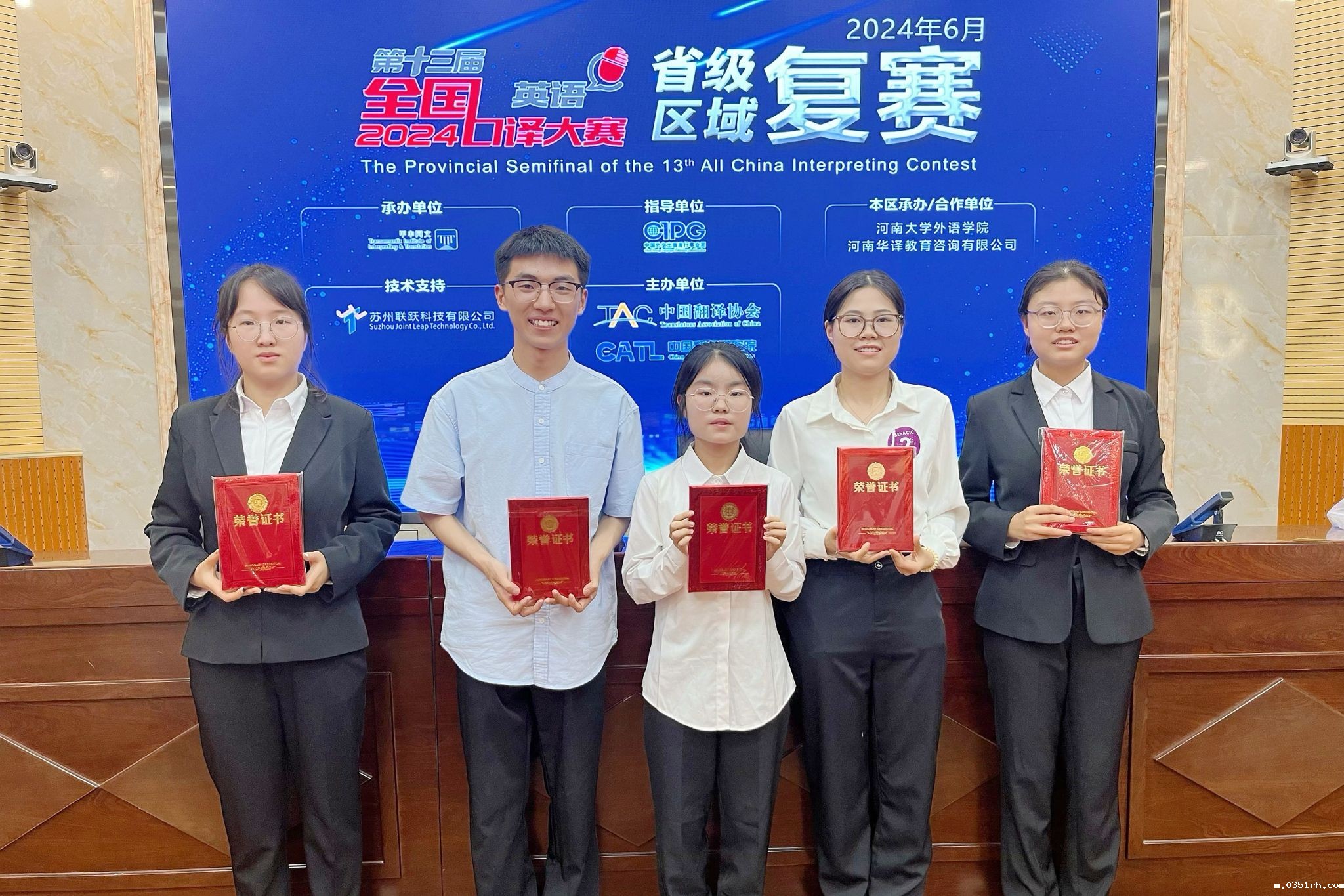 经过激烈角逐,来自我校外国语学院的朱瑞朝、王硕同学获得河南省省级复赛一等奖,直接晋级国家赛;陈荟竹、张雅妮同学获得河南省省级复赛二等奖,毛馨怡同学获得河南省省级复赛三等奖;外国语学院教师许晖获得“优秀口译指导教师奖”。这是我校大学生参加该项赛事以来获得的最佳成绩,标志着我校外国语口译教学水平取得长足发展和良好效果。