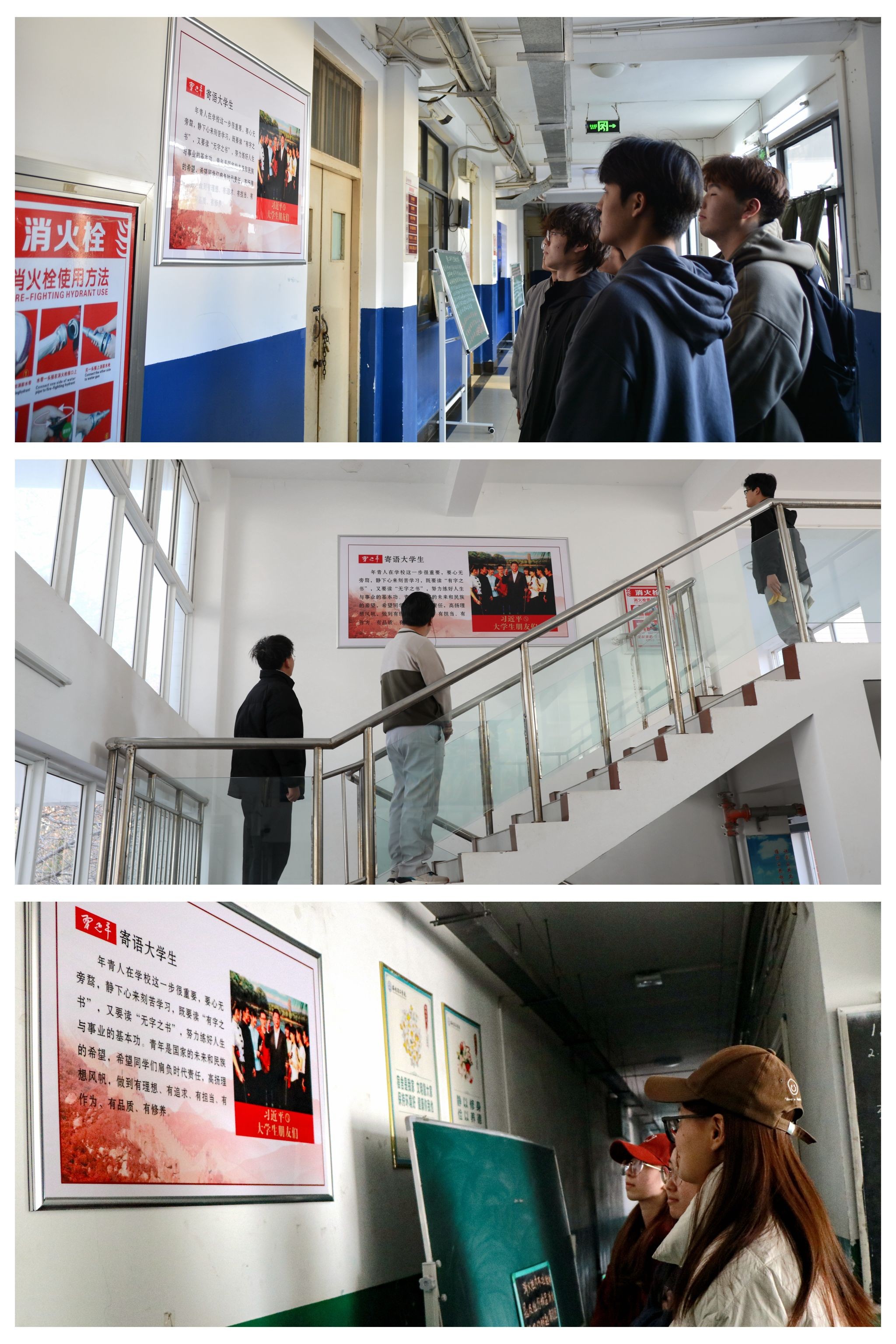 全新的宣传展板图文并茂,涵盖了习近平总书记关于教育的重要论述、关于青年大学生的寄语等内容。以润物细无声的形式,将思想政治工作与楼宇文化建设有机结合,引导广大教师坚守育人初心,争做新时代“四有”好老师;鼓励青年学生要不负时代、不负韶华,在青春的赛道上奋力奔跑,争做有理想、敢担当、能吃苦、肯奋斗的新时代好青年。