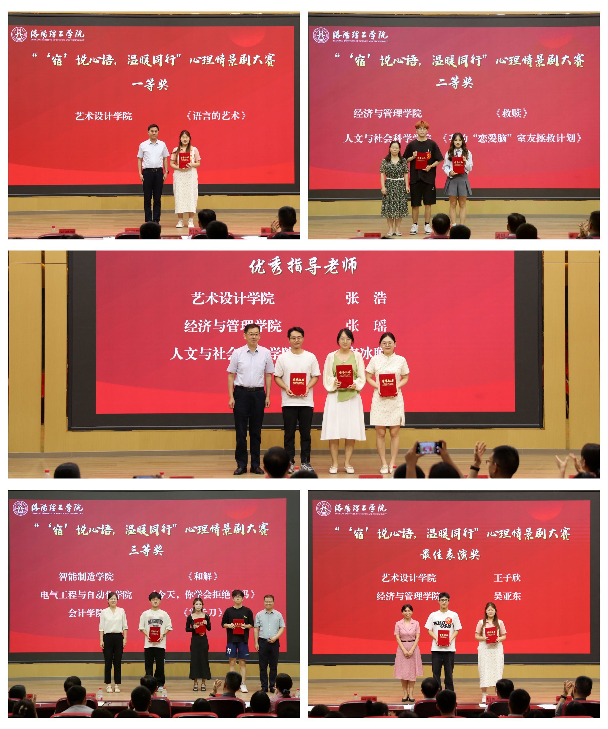 本次活动由大学生心理健康教育中心主办,材料科学与工程学院致实书院承办,自五月中旬启动以来,经学院初赛、全校复赛,最终有6支队伍入围决赛。经过激烈角逐,艺术设计学院《语言的艺术》获一等奖,经济与管理学院《救赎》、人文与社会科学学院《我的“恋爱脑”室友拯救计划》获二等奖,智能制造学院《和解》、电气工程与自动化学院《今天,你学会拒绝了吗》、会计学院《割舌刀》获三等奖;艺术设计学院张浩、经济与管理学院张瑶、人文与社会科学学院宋冰聪获最佳指导老师奖;艺术设计学院王子欣和经济与管理学院吴亚东2名同学获最佳表演奖。