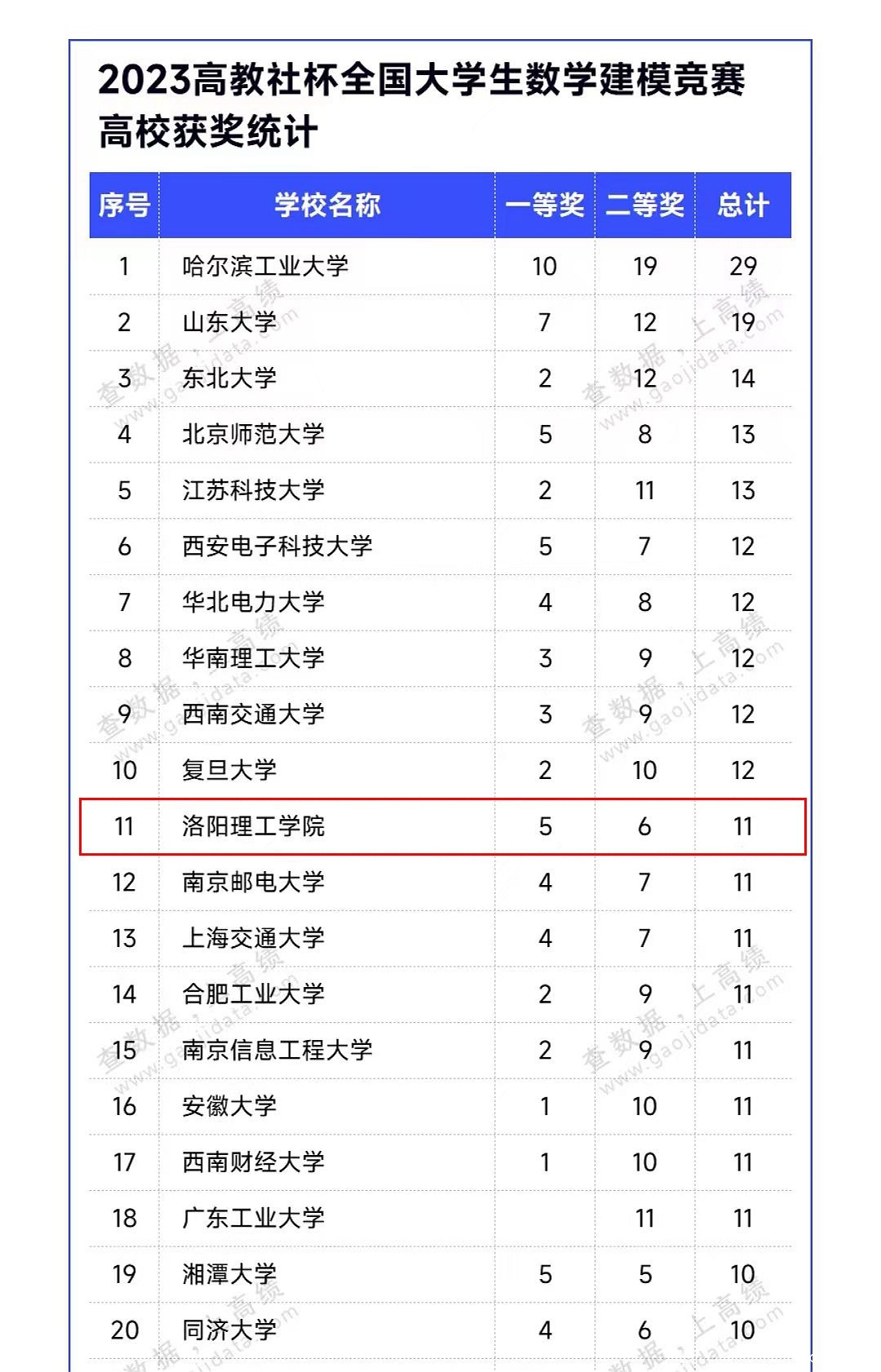 我校在2023年高教社杯全国大学生数学建模竞赛中,一等奖二等奖获奖总数位居全国高校第11名,图为高校一等奖二等奖获奖总数统计表。