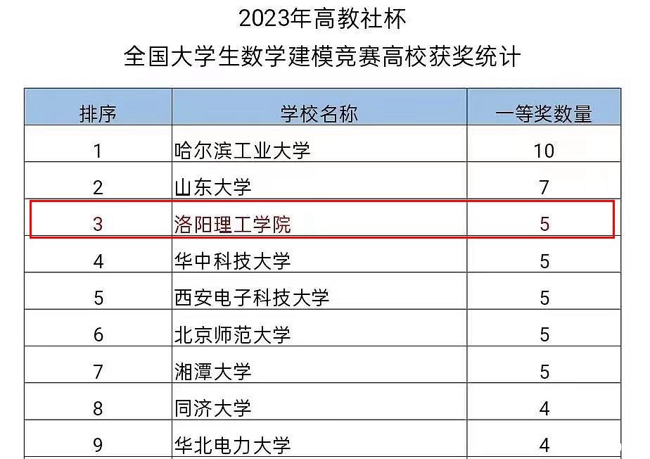 近日,2023年“高教社”杯全国大学生数学建模竞赛(China Undergraduate Mathematical Contest in Modeling)落下帷幕。我校获得显赫成绩,以5项一等奖位列全国高校一等奖排行榜第3名,排在前两名的分别是哈尔滨工业大学、山东大学。我校还获得二等奖6项,以总获奖数11项的成绩位列获奖总计排行榜第11名。我校的全国一等奖数量和国奖总数均创历史新高,位列全省第一,全国前列,实现了学校在该项赛事上新的突破。