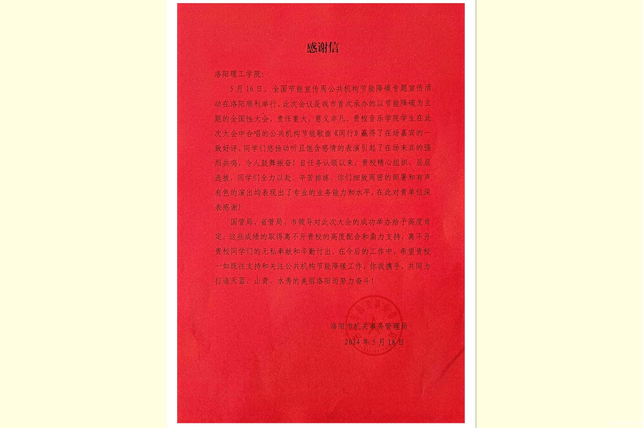 近日,洛阳市机关事务管理局向我校发来感谢信,对学校积极组织参与全国节能宣传周公共机构节能降碳专题宣传活动表示高度肯定,对教育科学与音乐学院广大师生的辛勤付出表示感谢和敬意。