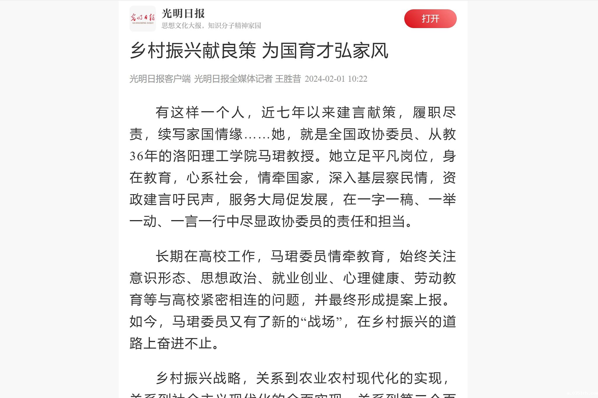 光明日报客户端2024年2月1日,《乡村振兴献良策 为国育才弘家风》: