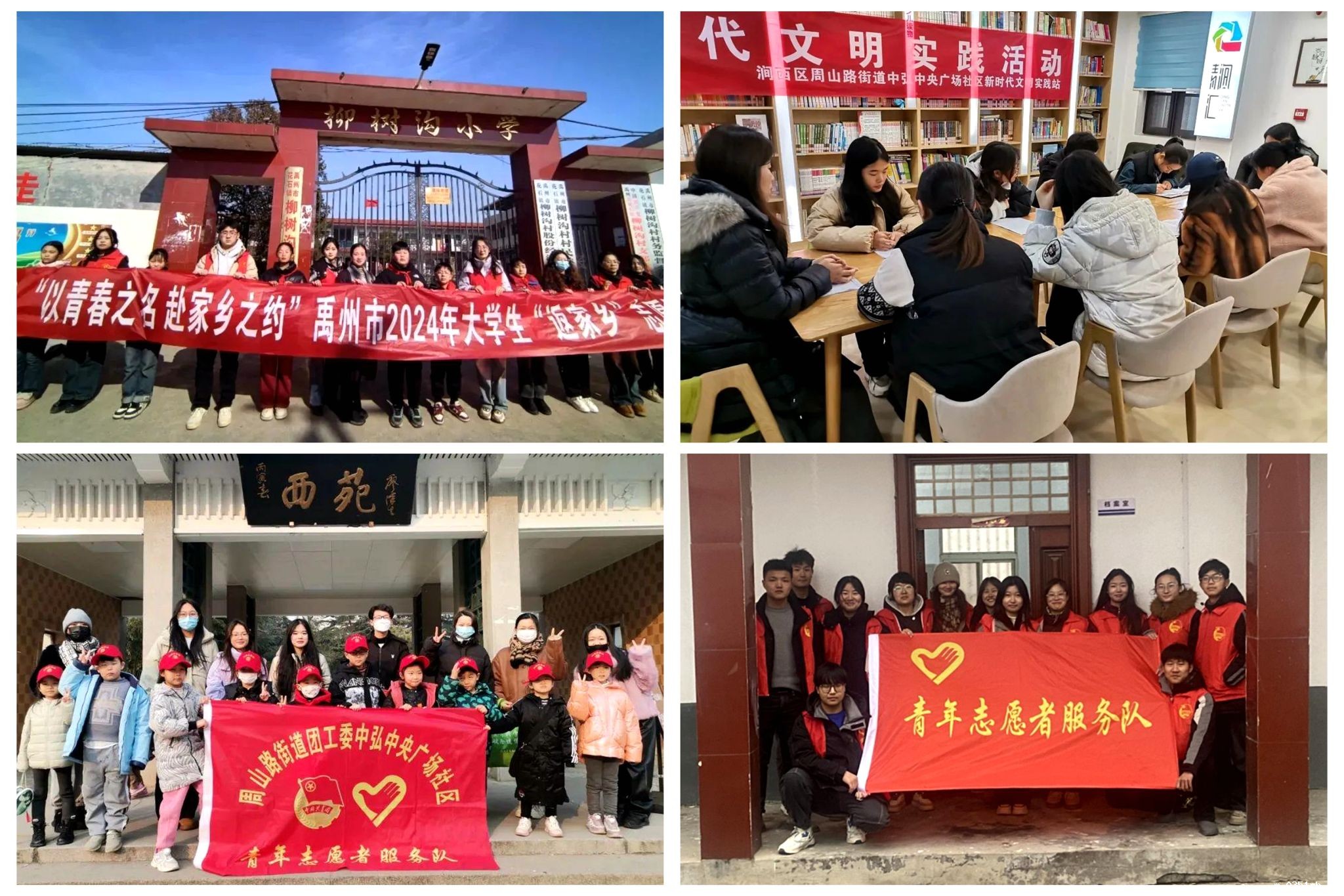材料科学与工程学院、环境工程与化学学院、经济与管理学院、会计学院、艺术设计学院、外国语学院、教育科学与音乐学院的同学,返乡后积极向社区报到参与社区实践活动。内容包括为社区儿童提供寒假托管班服务;春运期间,在高铁站开展卫生清扫保障旅客出行;在社区商铺摸排安全隐患,保障年节市场安全运营。经济与管理学院、会计学院的同学发挥专业所长,参与了河南省第五次全国经济普查工作。