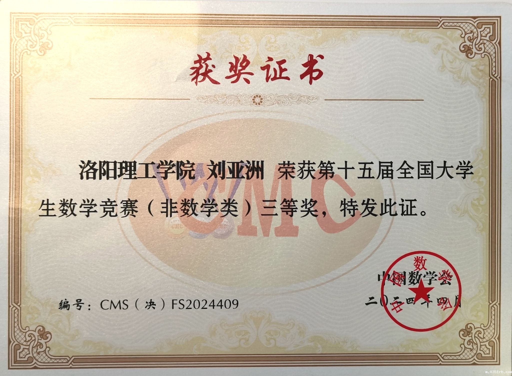 4月20日,由中国数学会主办、山东大学承办的第十五届全国大学生数学竞赛决赛在济南举行。我校计算机与信息工程学院2020级物联网工程专业学生刘亚洲(指导教师王云鹏)经过激烈角逐,荣获非数学组全国三等奖。
