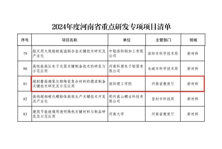 近日,河南省科学技术厅发布了《2024年度河南省重点研发专项拟立项公示》和《关于2024年度河南省重点研发专项项目任务书签订及后续管理事项的通知》,我校作为主持单位申报的《超耐磨高熵氧化物陶瓷复合材料的微波制备关键技术研究及示范应用》项目获批立项,资助经费190万元。这是我校继2023年获批1项省重点研发专项后,在该类项目申报中再次成功获批。