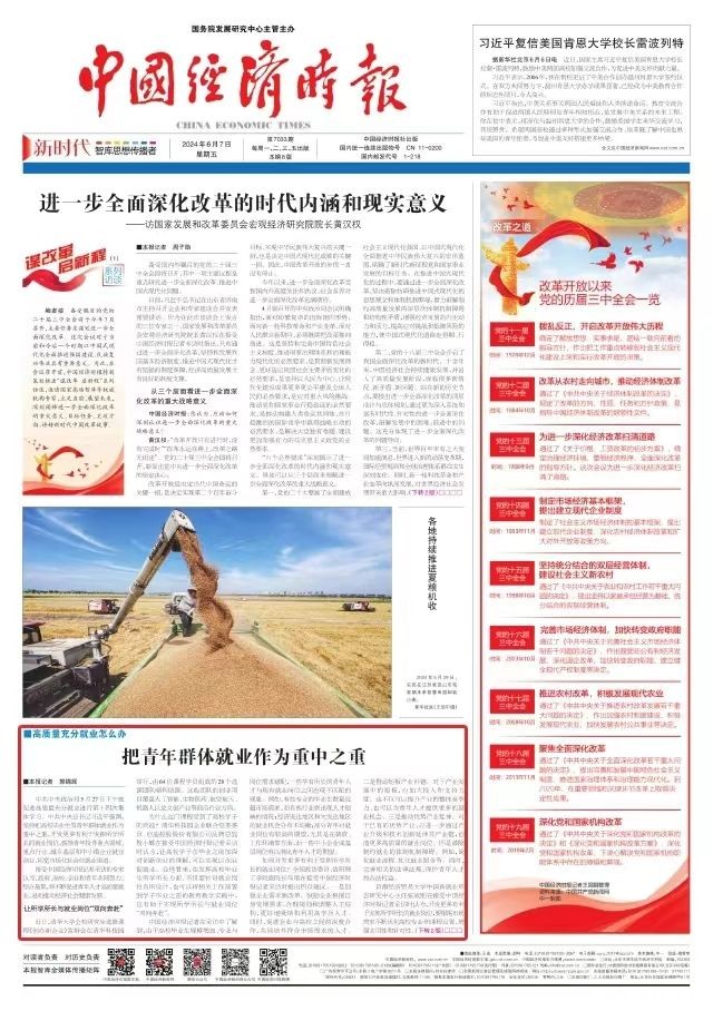 《中国经济时报》2024年6月7日头版,《高质量充分就业怎么办②丨把青年群体就业作为重中之重》