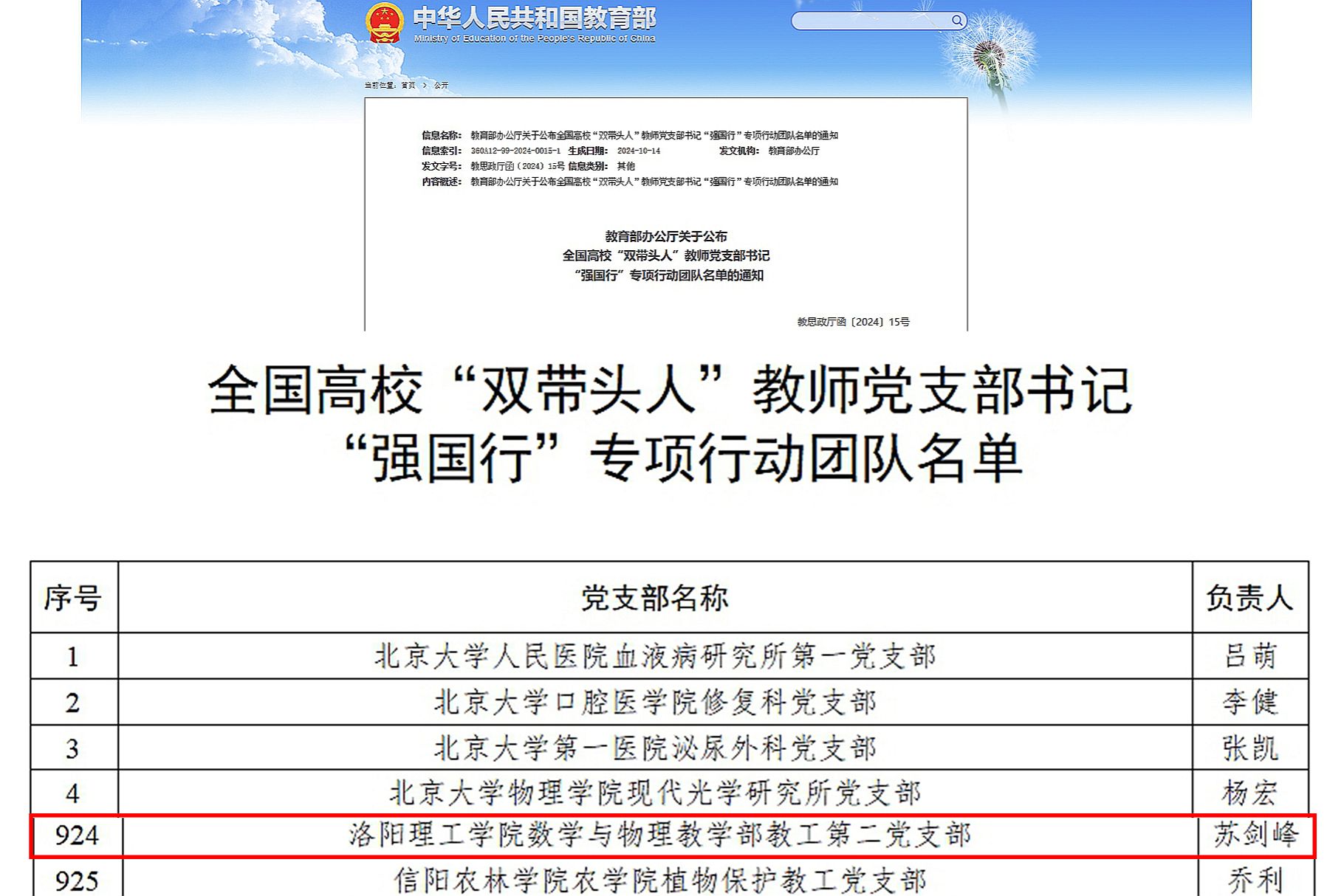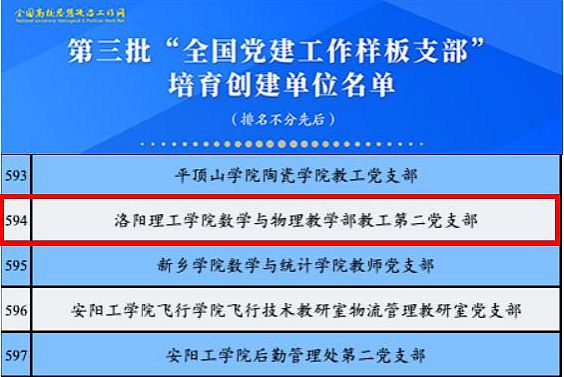 党支部对标“七个有力”,不断推进党支部标准化、规范化、特色化建设,坚持党建与事业发展深度融合,大力实施党建、教学、科研、社会服务“四轮驱动”,打造“党旗所指 先锋所向”和“三旗传承”党建品牌,以党建工作实效推动立德树人根本任务落实落细,推进全国党建工作样板支部建设。在党建阵地打造、国家自然科学基金申报、课程思政建设、科普教育等方面取得显著成果。其中,《大学物理》课程思政被中宣部作为经验典型在“学习强国”全国平台推介、《大学物理Ⅱ》被认定为河南省本科高校课程思政样板课程、“物理创新与探索实验室”被评选为洛阳市科普基地,支部党员在省部级以上科研项目和高水平论文申报发表数量方面名列前茅,并先后获得“河南省优秀党务工作者”、“第十五届河南省青年科技奖”、“河南省青年骨干教师”、“河南省教育厅学术技术带头人”、“洛阳市青年科技奖”等荣誉。