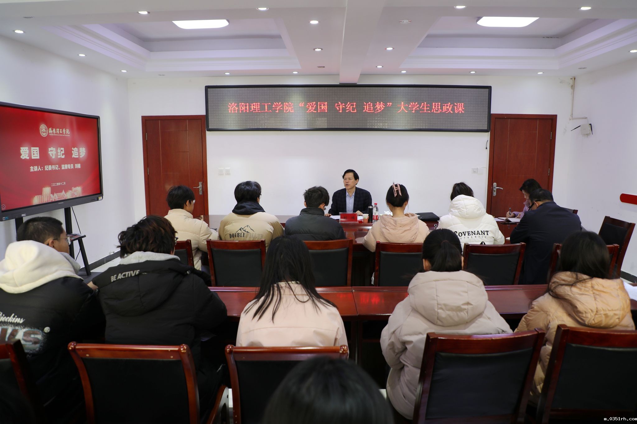 12月31日上午,纪委书记、监察专员刘楠参加“青马工程”学员座谈会,深入了解活动开展情况和参训学员近期学习、生活状况,并以“爱国 守纪 追梦”为主题上思想政治课。校团委班子成员、第十三期“青马工程”培训班学员共同听课。