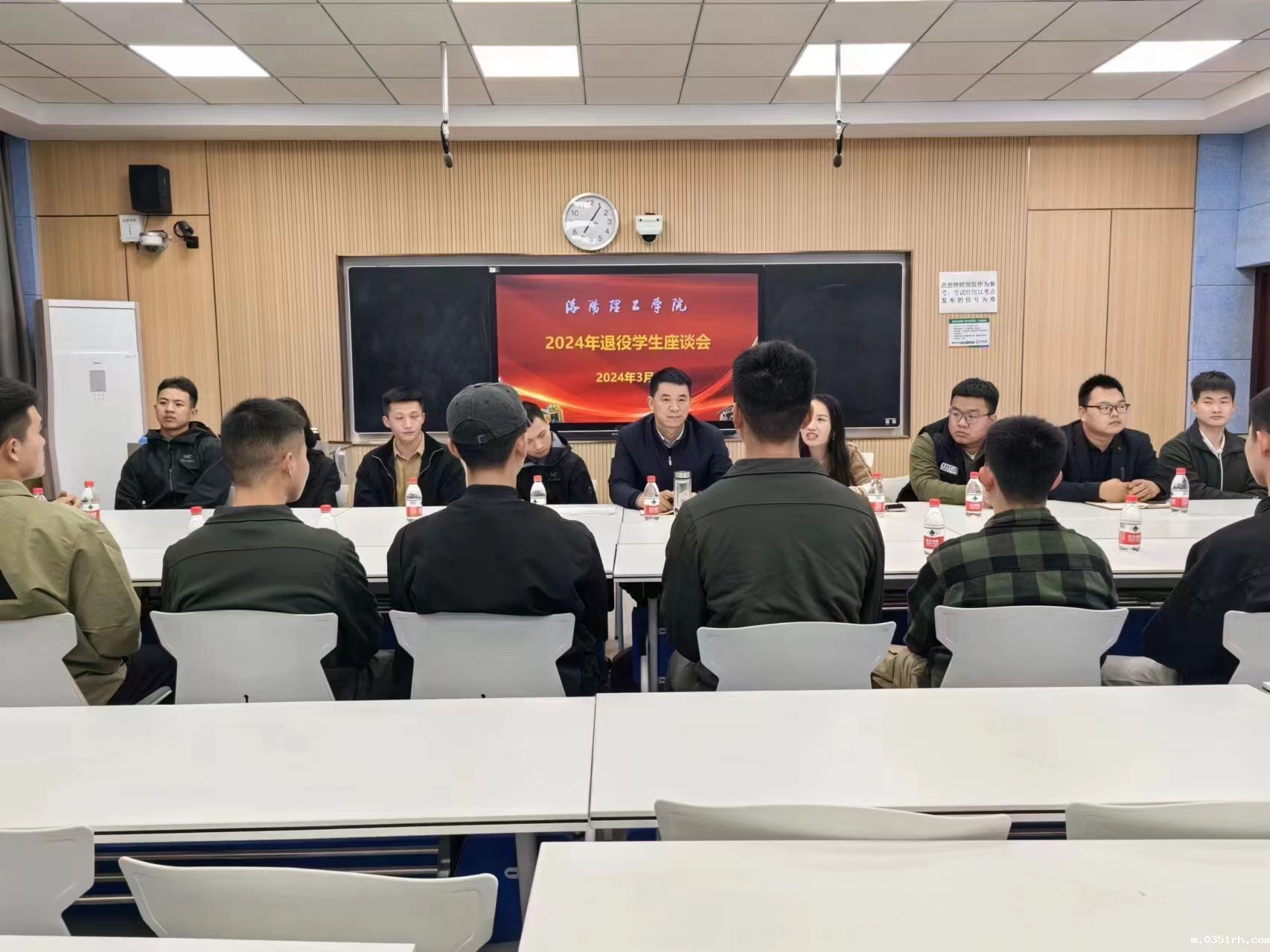 为进一步了解我校退役复学大学生士兵的思想状况,做好教育管理服务工作,3月27日,我校在王城校区公共教学楼AN401组织召开2024年春季退役复学学生座谈会,校武装部老师,学院征兵联络员老师代表、在校退役学生代表和2024年春季退役复学学生参加本次座谈会。