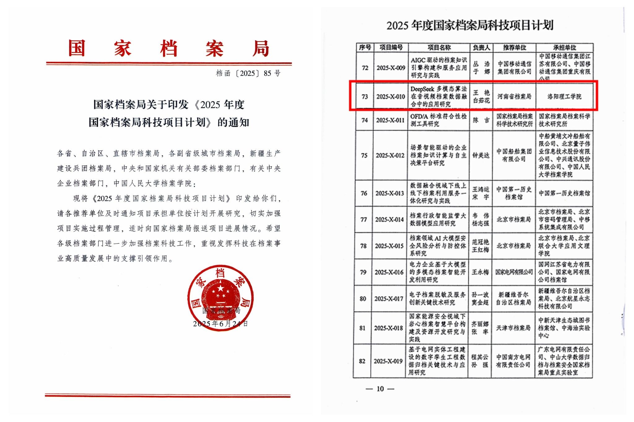 近日,国家档案局公布《2025年度国家档案局科技项目计划》,我校档案馆主持申报的课题“DeepSeek多模态算法在音视频档案数据融合中的应用研究”成功获批立项。该项目经河南省档案局专家评审推荐,并通过国家档案局严格审查、评议委员会评议及公示环节,成为2025年度河南省三个获批立项项目之一。这是我校档案馆首次获得国家级档案项目支持,且实现了我市在国家档案局科技项目立项上“零的突破”。