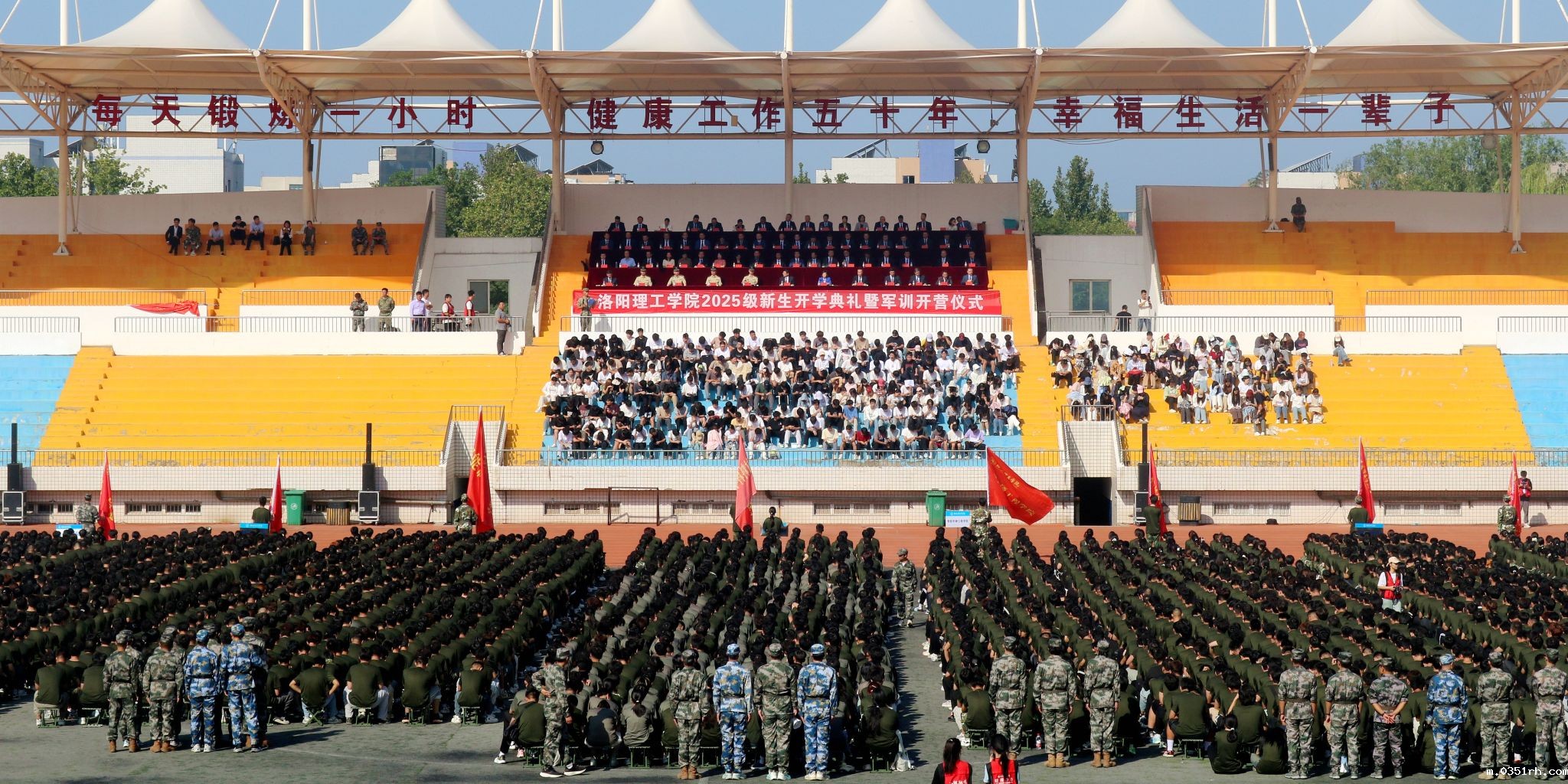 踏浪前行万里阔, 奋楫扬帆启新程。9月14日上午,我校2025级新生开学典礼暨军训开营仪式在王城校区东操场举行。参训部队首长和校领导卢志文、丁梧秀、曾涛、胡恩立、黄志全、王新武、上官林建、李传锋出席活动,相关部门负责人、教师代表、校友代表及6000余名2025级新生参加活动。开学典礼暨军训开营仪式由党委副书记胡恩立主持。